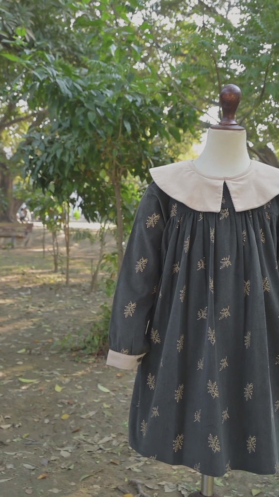 A premium dress by Tinnie Tots, crafted with printed corduroy fabric with statement collar details. High-end stitching, styling and detailing. Non-Allergic fabric, gentle to the baby skin. Perfect for your little princess. Highly Recommended for Fall & Winter season.